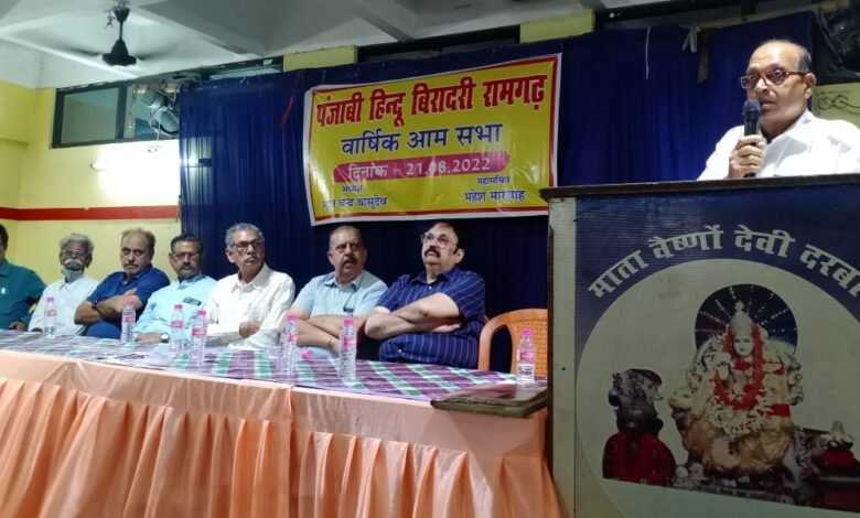 रामगढ़। पंजाबी हिन्दू बिरादरी की 37वीं वार्षिक आम सभा रविवार की देर शाम वैष्णों देवी मंदिर स्थित बिरादरी हॉल में संपन्न हुई। जिसकी अध्यक्षता संस्था के अध्यक्ष सूरत चन्द्र वासुदेव व संचालन महासचिव महेश मारवाह ने किया। सभा को संबोधित करते हुए श्री वासुदेव ने बिरादरी की भूमिका को और अधिक कारगर बनाने के लिए अधिक से अधिक सामाजिक कार्यक्रम आयोजित किए जाने पर जोर दिया। चालू वित्तीय वर्ष के दौरान किए जाने वाले संभावित कार्यक्रमों की रूपरेखा से सभा को अवगत कराया। उन्होंने कहा कि इस वर्ष अधिक से अधिक सामाजिक कार्यक्रम किए जाने की योजना बनाई गई है। बिरादरी के महासचिव महेश मारवाह (वरिष्ठ पत्रकार) ने सचिव प्रतिवेदन प्रस्तुत करते हुए वित्तीय वर्ष सत्र 2021-22 में संपन्न हुए सभी सामाजिक व धार्मिक कार्यक्रमों की सफलता को सशक्त एकता एवं सदस्यों की सक्रियता का परिणाम बताया। उन्होंने एक वर्ष के दौरान किए गए विकास कार्यों की जानकारी एवं भावी विकास योजनाओं की रूपरेखा से सदस्यों को अवगत कराया। सभा में मुख्य रूप से मनजीत साहनी, हेमेन्द्र सौंधी, विश्वनाथ अरोड़ा, रमण मेहरा, सुभाष चन्द्र मारवाह, नरेश चन्द्र मारवाह, ओमकार मल्होत्रा, कैलाश शर्मा, राजीव चड्डा, संजीव चड्डा, बलवंत राय मारवाह, महेन्द्र पाल मारवाह, संजीव धमीजा, पवन मारवाह, मनीष मारवाह, विशाल वासुदेव, विजय सोबती, अनिल छाबड़ा, अजीत अग्रवाल, जनक रानी, वीणा मारवाह, अंजू चड्डा, संगीता मारवाह, मीना मल्होत्रा, पूनम सौंधी, मंजू कक्कड़ आदि मौजूद थे।