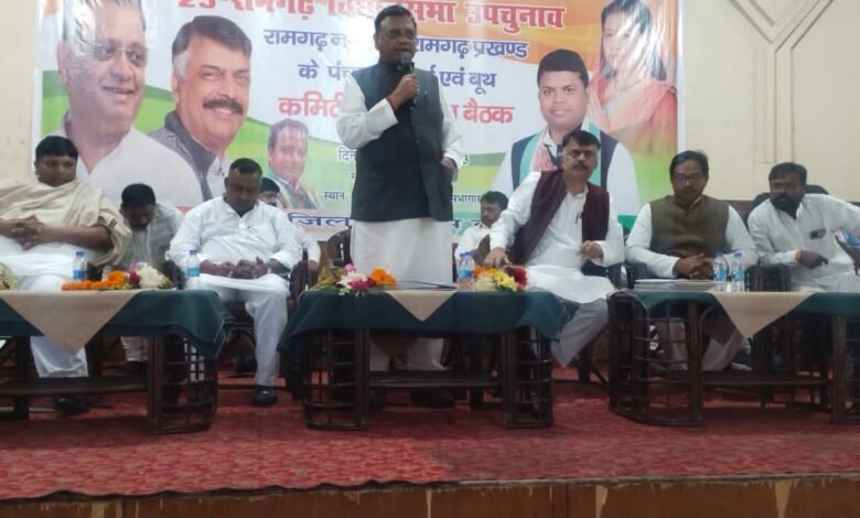 : रामगढ़ विधानसभा उपचुनाव के निमित्त रामगढ़ नगर एवं रामगढ़ प्रखंड के पंचायत वार्ड एवं बूथ समितियों के पदाधिकारियों की महत्वपूर्ण बैठक स्थानीय जिमखाना क्लब रामगढ़ के सभागार में सम्पन्न हुई जिसकी अध्यक्षता रामगढ़ जिलाध्यक्ष मुन्ना पासवान एम संचालन मुकेश यादव ने किया बैठक में बतौर मुख्य अतिथि प्रदेश कांग्रेस प्रभारी श्रीअविनाश पांडे, विशिष्ट अतिथि प्रदेश कांग्रेस अध्यक्ष राजेश ठाकुर उनके साथ स्वास्थ्य मंत्री बनना गुप्ता, कृषि मंत्री बादल पत्रलेख, कार्यकारी अध्यक्ष शहजादा अनवर पूर्व मंत्री योगेंद्र साव उपस्थित रहे l