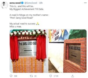 सोनू सूद ने शेयर की अपने जीवन सबसे बड़ी उपलब्धि, मोगा में मां के नाम पर रखा गया रोड का नाम