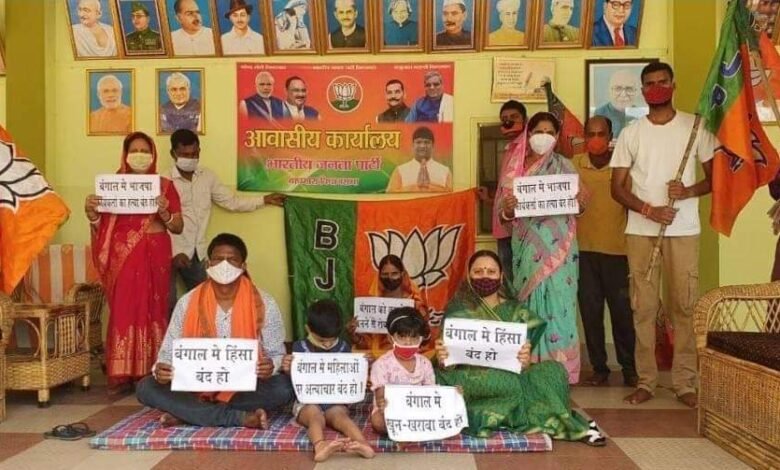 लोकतंत्र पर गलत मानसिकता रखने वालो पर कड़ी से कड़ी कारवाई हो, इसलिए आज इस सांकेतिक धरणा के माध्यम से प्रधानमंत्री तथा राष्ट्रपति से पश्चिम बंगाल में अविलंब राष्ट्रपति शासन लागू करने की मांग करता हूँ।तो वही *बाघमारा विधायक के धर्मपत्नी सह भाजपा नेत्री सावित्री देवी* ने कहा चुनाव परिणाम के बाद शुरू हुई हिंसा पर नियंत्रण में राज्य सरकार पूरी तरह नाकाम साबित हुई है.बंगाल पुलिस टीएमसी कैडर की तरह काम कर रही है ।इस दौरान परिवार के सभी सदस्यगण मौजदू रहे है।