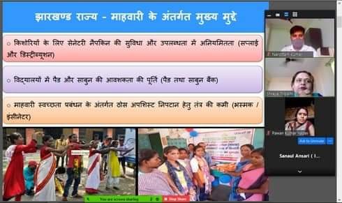 इस वेविनार में राज्य स्तर से यूनिसेफ की कंसलटेंट के द्वारा माहवारी स्वच्छता प्रबंधन और इसके समुचित निपटान और रूरल एरिया में भ्रांतियां को कैसे दूर कर पाएंगे, समाज में कितना सुधार करना है सभी विभागों को कन्वेंशन मोड में किस प्रकार मिलकर समाज को सुधार सकते है स्लाइड के माध्यम से दिखाया गया। DPM JSLPS ने कहा कि SHG दीदी के माध्यम से गाँव में स्वच्छता के प्रति लोगों को जागरूक करने के लिए प्रेरित किया जाएगा। इस कार्य मे जलसहिया को अहम किरदार दिया गया है। स्वच्छता के प्रति जागरूक करने जैसे अन्य बातों को विस्तार पूर्वक इस बैठक के माध्यम से संबंधित लोगों को जानकारी दी गई। बैठक में किशोरियों को सेनेटरी पैड के महत्व के बारे में बताने के लिए कहा गया। इस वेविनार में SBM टीम के सभी कर्मी, UNICEF IDF के सभी कर्मी ने भाग लिया।